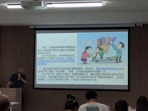 赵鹏杰老师通过解释双减政策,提出坚持教育为社会主义现代化建设服务、为人民服务,把立德树人作为教育的根本任务,全面实施素质教育,培养德智体美全面发展的社会主义建设者和接班人,努力办好人民满意的教育这一观点。赵老师详细讲解了课程理念与设计思路,老师在设计课程内容时要聚焦核心素养,组织课程内容,借鉴人类优秀文化成果,追求精神高度、文化内涵、艺术价值相统一。