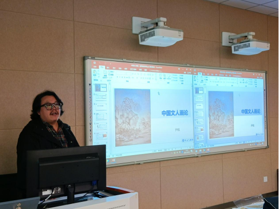 报告会上,尹枫老师先从文人画的传承与发展切入主题。主要讲述了文人与文人画的概念。他从何为文人、何为文人的思想追求、文人画的概念和渊源、文人之画与文人画四个方面进行讲解。向大家重点分析了中国文人画的发展历程。最后结合个人画作,阐释了自己的创作历程和创作思想,并向学员推荐了《中国艺术精神》《浮生六记》等书籍。