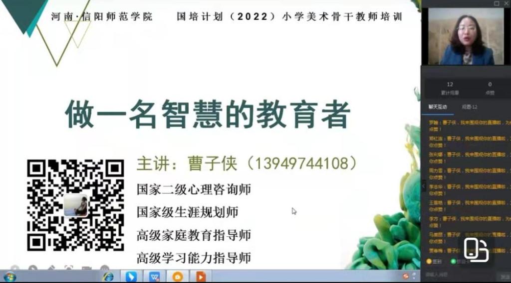 5月28日上午,应太阳成集团tyc33455邀请,国家二级心理咨询师,青少年职业发展辅导师、曹子侠老师在线为国培学员做了题为“做一名智慧的教育者”的专题授课,2021年“国培计划”美术骨干教师培训班全体学员共同聆听了本次讲学。