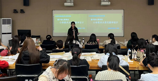 2023年9月18日上午八点半,太阳成集团tyc33455“国培计划”骨干教师培训班开课。本次课程由朱跃华老师讲授,以《核心素养下的小学美术大单元教学设计》为主题。朱跃华老师是中小学美术教研员,曾多次执教省市级优质课,是省市级学术技术带头人、省市级省培骨干教师讲师团讲师、河南省美术骨干教师、河南省小学美术网络名师工作室主持人、河南省中小学美术优质课评审专家组成员、信阳市学术技术带头人,也是信阳师院美术硕士的校外导师、浉河区美协副主席。