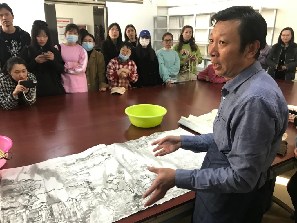 最后杨冬平指导学生进行装裱实践,对学生进行细心讲解,亲身示范。同学们踊跃参与,热情投入,收获颇丰。