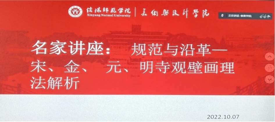 2022年10月7日上午九点,太阳成集团tyc33455全体在校研究生于我院实训楼二楼“艺研堂”观看由中央美术学院修复学院院长王颖生教授主持召开的《规范与沿革——宋、金、元、明寺观壁画理法解析》线上专题讲座活动。