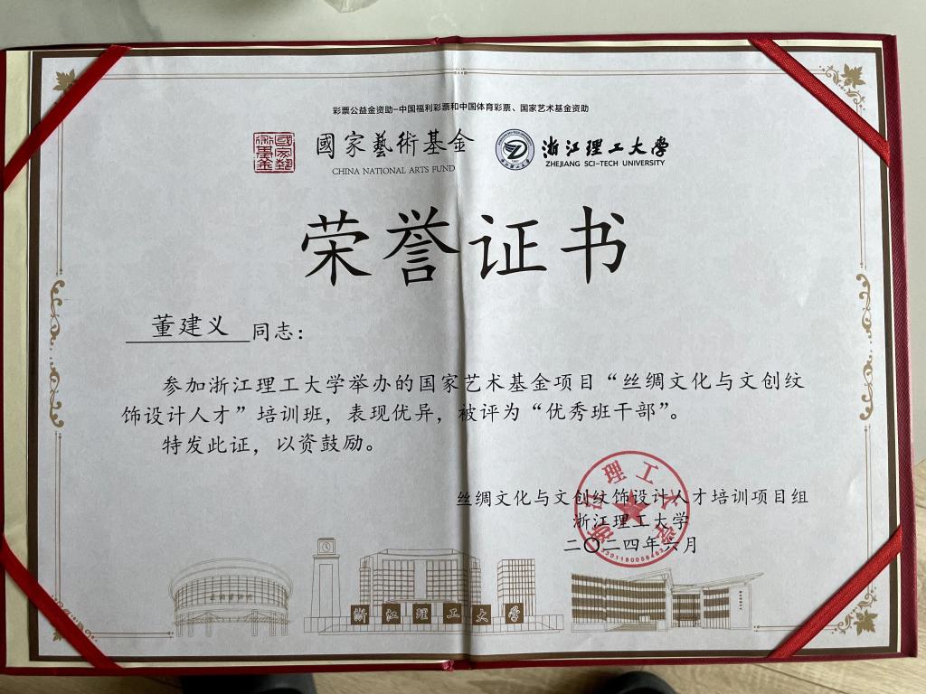 因在培训期间表现优异,在6月26日的项目结业典礼上,我院董建义副教授顺利通过答辩,并被丝绸文化与文创纹饰设计人才培训项目组和浙江理工大学评为“优秀班干部”。