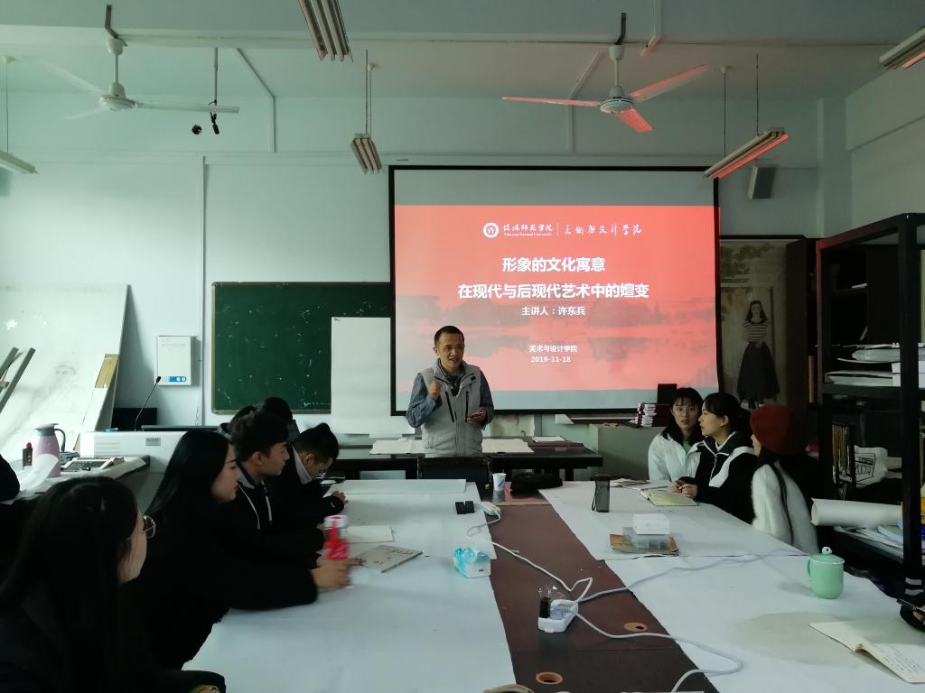 11月18日下午,我院许东兵博士在艺术楼研究生教室作了题为“形象的文化寓意在现代与后现代艺术中的嬗变”的专题学术讲座,全体研究生参加此次讲座并积极讨论。