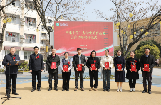 在“四季十美”大美育浸润计划暨“春美师大·向美而生”启动仪式上,我校聘任华森社区非遗编珠传承人何慧和剪纸非遗传承人谢玉娇为我校“美育导师”,校领导朱晓东向两位传承人颁发了聘书。