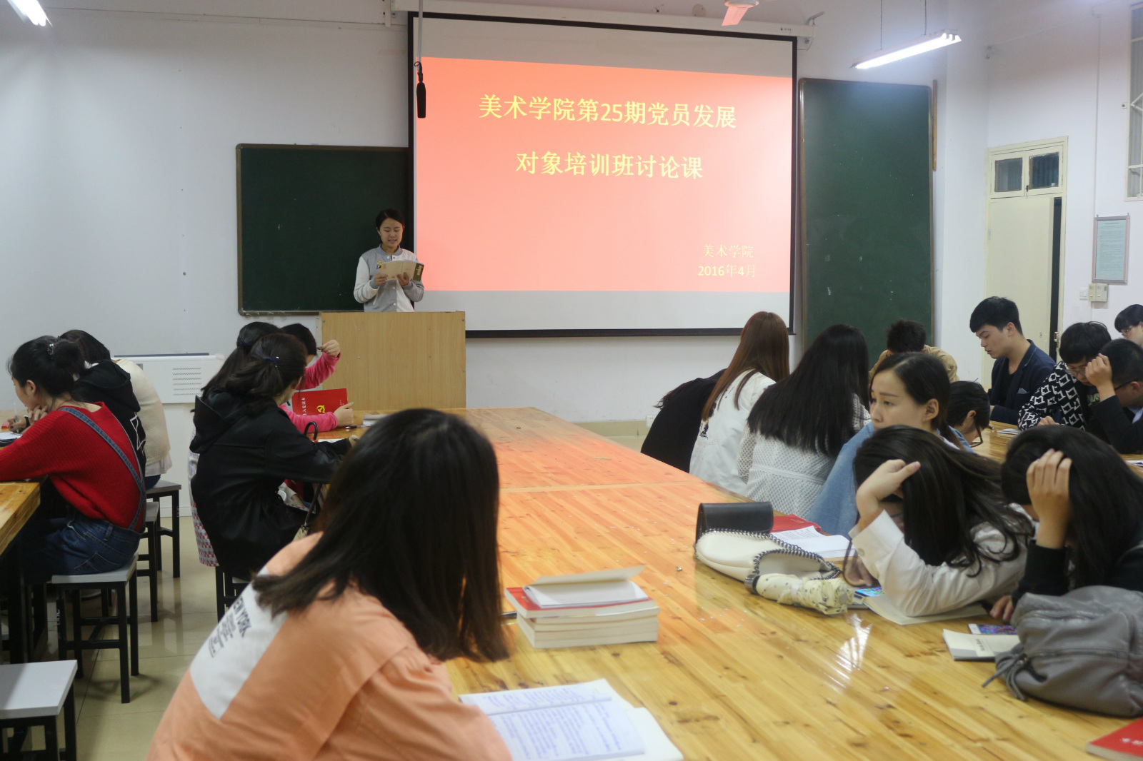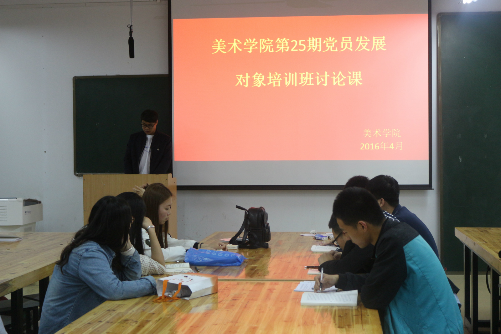 4月26日晚,美术学院第25期党员发展对象培训班学员在艺术楼公共教室308开展党员发展对象培训班讨论课,围绕“如何端正入党动机和发挥党员先锋模范作用的途径和方法”展开讨论。
