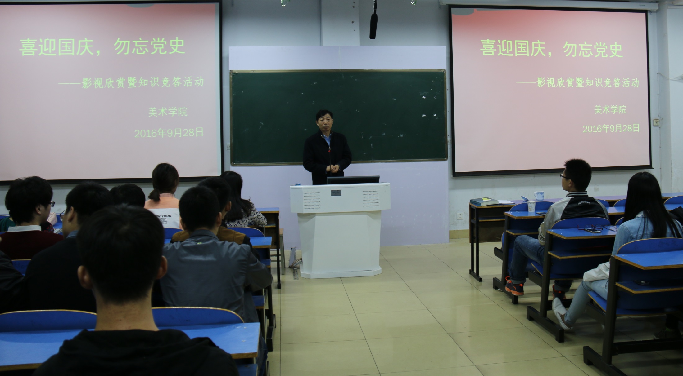9月28日晚,美术学院在艺术楼307室组织全体学生党员参加了“喜迎国庆,勿忘党史”主题教育活动。美术学院党委书记周子良,专职辅导员张锐、施远参加活动。活动由施远主持。