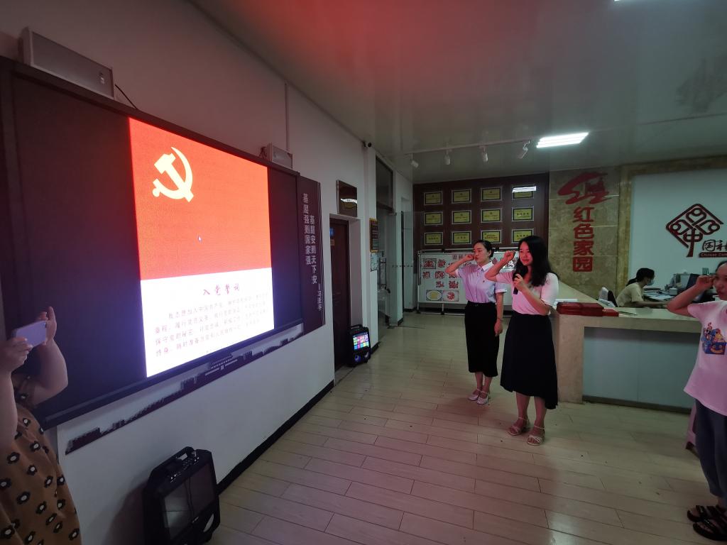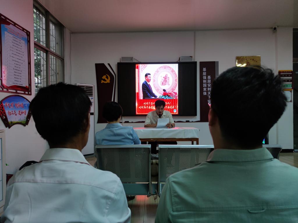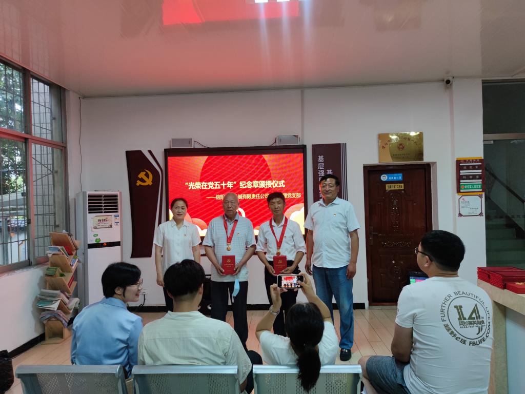 华森社区党支部书记周晓燕、信阳木工机械有限责任公司社区管理党支部书记冯传前在全体党员的见证下,为杨大德、徐洪久、陶维轩颁发了“光荣在党五十年”纪念章,号召大家积极向老党员学习,坚守入党初心。在我校教师余艳凯带领下,全体党员面向党旗、举起右拳,庄重的重温了入党誓词,再一次接受了心灵的洗礼。马克思主义学院教师郑晨霞、研究生鲁桐君、汤欢带领全体党员进行了习近平金句研学活动,分别以每日金句“大别山革命精神是我党的精神财富”“江山就是人民、人民就是江山,打江山、守江山,守的是人民的心。”“不断满足人民对美好生活的向往”为引和大家分享了学习心得,赢得阵阵掌声。参会人员还一同收看了《党章》解读视频,参与了社区“金牛达人”表彰活动。
