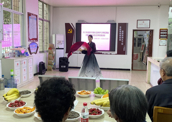 紧接着全体志愿者们走上舞台带来合唱《你笑起来真好看》,并将精心准备的团扇送给老人。退役军人李大爷借景抒情,现场献唱热血军歌《我是一个兵》,大家被歌曲感染,情不自禁地跟唱起来。现场气氛温情融洽,充满欢乐。参加活动的社区老人表示,第一次参加这么热闹的集体生日宴会,对于信阳师范学院精心准备的节目很受感动,感谢大家提供了这个温暖、温馨的平台。