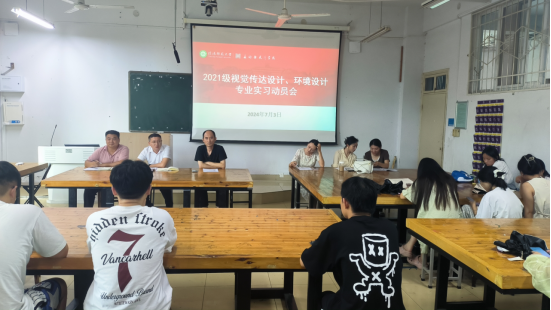 为做好2021级环境设计专业、视觉传达设计专业秋季专业实习工作,我院于7月3日在艺术楼308教室召开2021级环境设计专业与视觉传达设计专业的秋季专业实习动员大会。副院长张江波、党委副书记周刚、环境设计专业教研室主任甘露、视觉传达设计专业教研室主任刘焱、教学秘书明政、辅导员郑波及2021级全体设计专业学生共同参加会议,会议由郑波主持,线上线下同时进行。