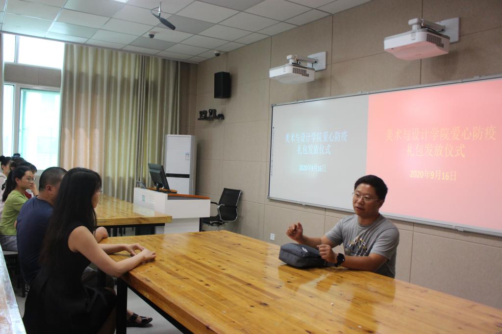 9月16日,我院于艺术楼217教室举办爱心防疫包发放仪式。党委副书记杨轶中,团委老师郑波,班主任邹青宸、张暄以及学生代表共同参加。发放仪式由杨轶中主持。