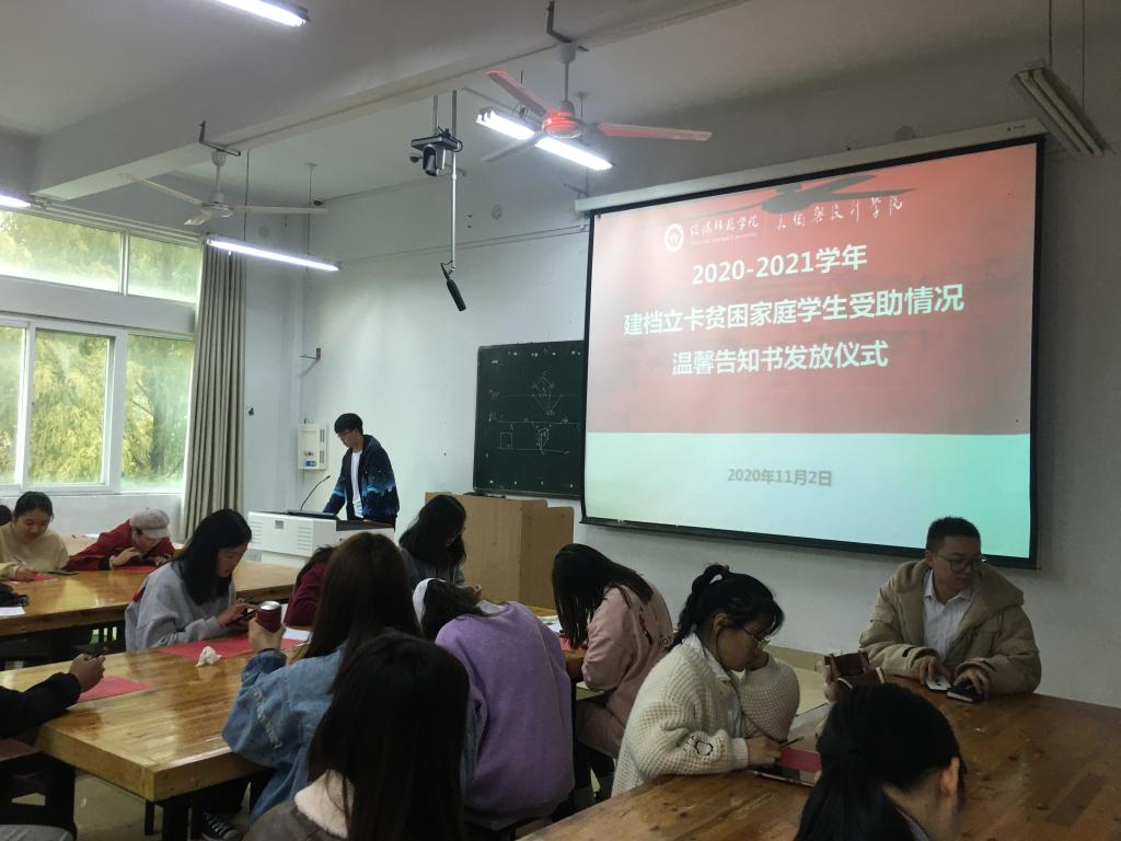 为全面落实各项资助政策,及时向学生及家长做好宣传告知,11月2日,太阳成集团tyc33455在艺术楼308室举行了2020-2021学年建档立卡学生温馨告知书发放仪式,我院全体建档立卡学生参加了此次仪式。仪式由辅导员胡霁芳主持。