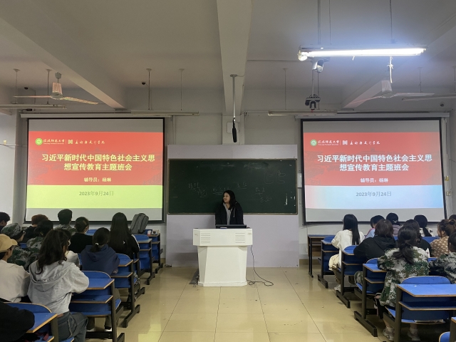 为落实立德树人根本任务,教育引导广大学生自觉将个人理想融入国家和民族的事业之中,9月24日,我院于艺术楼307召开习近平新时代中国特色社会主义思想宣传教育主题班会。班会由新生班主任杨琳主持,2023级全体新生共同参加。