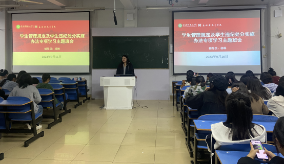 为进一步加强学生日常管理,维护学校正常的教学秩序和生活秩序,规范学生日常行为,营造和谐的校园氛围。9月16日,我院于艺术楼307召开学生管理规定及学生学生违纪处分实施办法专项学习主题班会。本次班会由新生班主任杨琳主持,2023级全体新生共同参加。