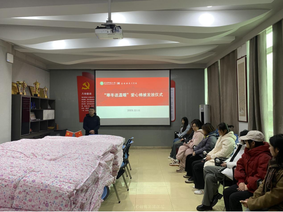 寒冬相聚,情满校园。为更好的贯彻落实国家资助政策,推动教育事业的发展,深切关心家庭经济困难学生,将资助落实于行动之中。12月11日,我院在艺术楼进行了“寒冬送温暖”爱心棉被发放活动。院党委副书记周刚、辅导员郑波、杨琳及50余名困难学生共同参加了此次活动。