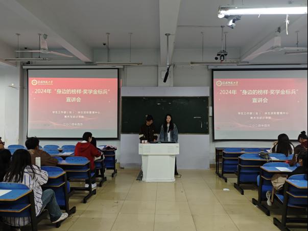 4月16日,我院在艺术楼307举行了2024年“身边的榜样·奖学金标兵”宣讲会,校奖学金标兵王世文、王雨婷、张乃戈主讲,2023级200余名学生代表参加,会议由杨琳主持。