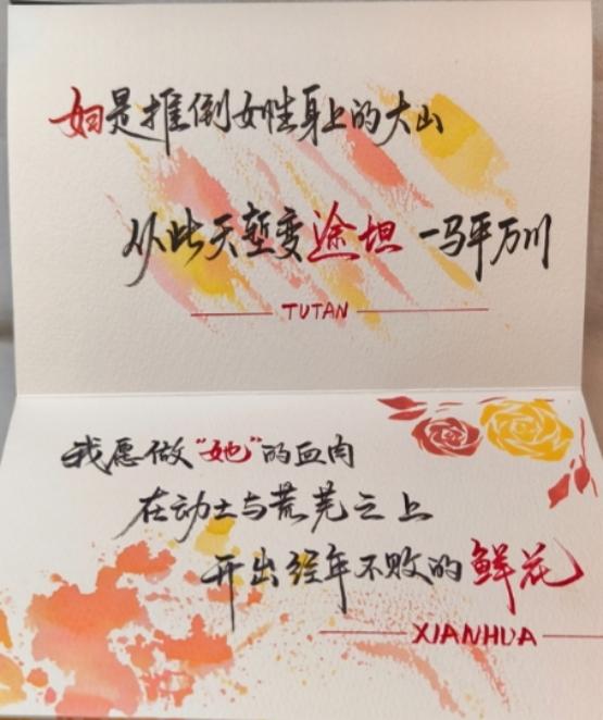 本次活动鼓励同学们通过贺卡创作表达对女生的祝福。参与者提交的作品形式丰富:手绘贺卡笔触细腻,搭配励志话语或温馨寄语;电子贺卡融合动画、音效元素,兼具科技感与艺术感。所有作品围绕“温暖”“成长”“美好”主题展开,每一份都凝聚着创作者的心意。