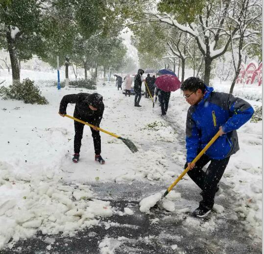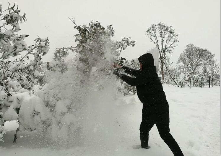 近日,信阳降下区域性特大暴雪,在一饱壮美雪景的同时,这场暴雪也为师生们的出行带来了重多安全隐患。校园里银装素裹,积雪逐渐增多,造成树木主干和侧枝折损严重。为了保障校园内师生出行安全和保护绿化成果,我院积极组织师生开展志愿除雪活动。