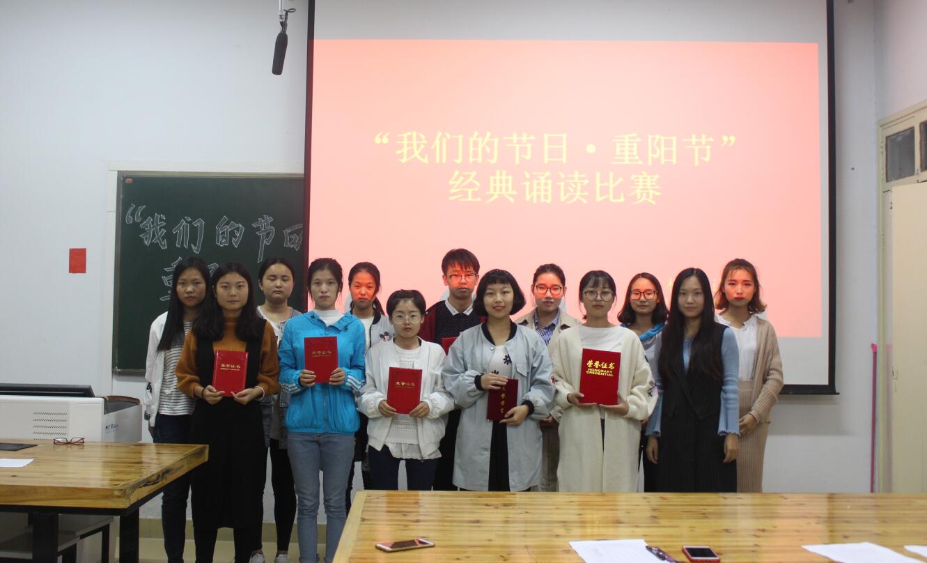 在九月九日重阳佳节来临之际,太阳成集团tyc33455于艺术楼306室举行“我们的节日·重阳节”经典诵读比赛,我院辅导员饶海虹及学生会部分干部代表出席并担任此次比赛的评审,我院各个班级代表积极参赛。