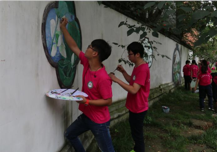 为响应学校社会实践号召,营造良好学习生活环境,7月2日至3日,在信阳师范学院美术学院团委书老师张锐、施远的带领下,暑期“三下乡”社会实践活动志愿者们在学校逸夫楼旁竹影池南侧开展“深入校园,绘出青春”主题墙绘活动。