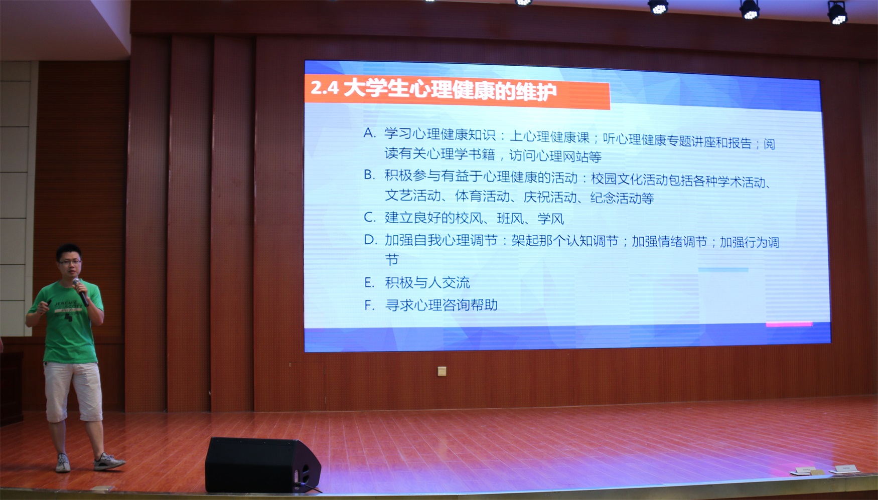 张锐从宗教问题、心理问题、财产安全问题、网络问题、交通问题、消防问题等六个方面作了全面、系统的介绍。期间,张锐鼓励大学生将社会主义核心价值体系建设与自身的信仰有机结合起来,充分彰显社会主义核心价值体系的吸引力与感召力,就能够积极培育并有效形成当代大学生中国特色社会主义共同理想与科学信仰。
