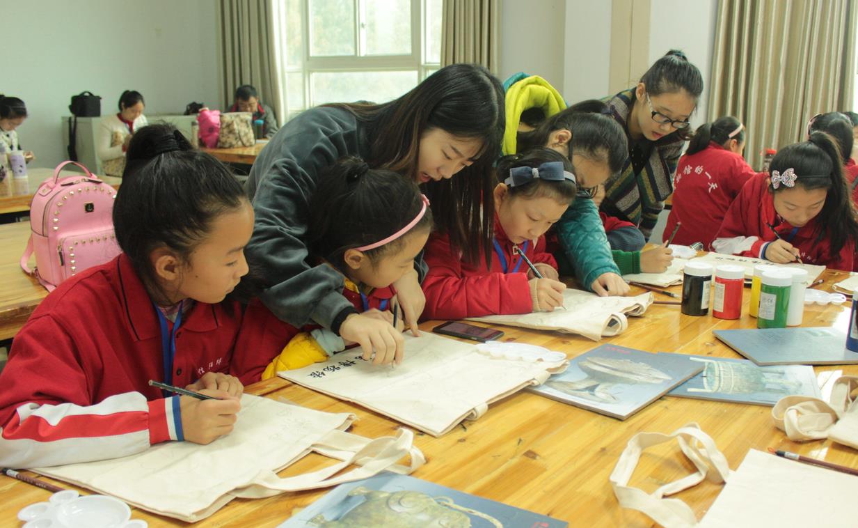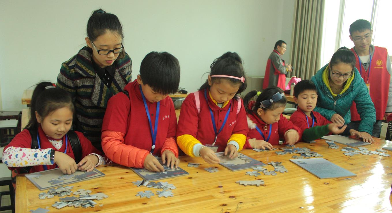 活动伊始,由我院志愿者为学生播放信阳师范学院宣传片,帮助这些孩子们了解我校,随后进行青铜器拼图和手绘环保袋活动。在拼图环节,志愿者与学生互动,帮助孩子们一起完成拼图;在手绘环节,志愿者们或手把手地教孩子们画出自己喜欢的动物、水果、卡通人物,或与孩子们一同调色,或是在孩子们完成作品之后,给他们修改不足之处。期间,对于孩子们提出的各种问题,志愿者们耐心地做出解答。活动现场气氛热烈,充满了孩子们的欢声笑语。最后,志愿者们与孩子们合影留念。