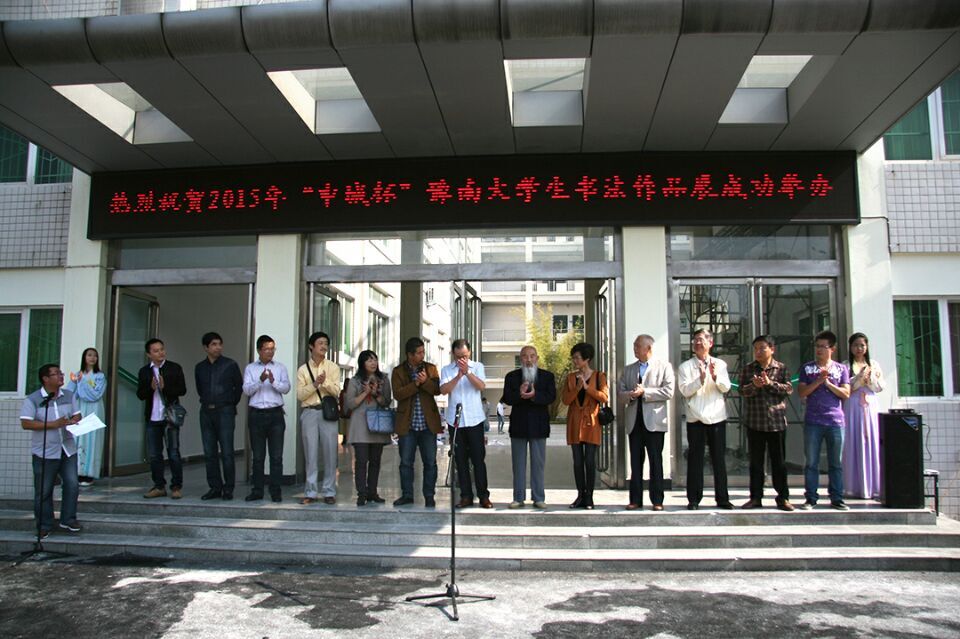 10月17日上午,由信阳师范学院团委、信阳师范学院大学生社团联合会联合主办,河南大学团委、黄淮学院团委、信阳农林学院团委、信阳师范学院华锐学院团委、信阳职业技术学院团委协办,信阳师范学院美术学院团总支、信阳师范学院大学生书法爱好者协会、大学生美术爱好者协会、河南大学大学生书法协会、黄淮学院大学生书法协会等高校相关社团共同承办的第十届“申城杯”大学生书画展在艺术楼广场隆重开幕。信阳市书法家协会副秘书长丁元清先生,中国书法家协会会员、信阳书画院顾问戴南园老先生,浉河区书法家协会主席西中明先生,浉河区书法家协会顾问张剑冰先生,浉河区书法家协会副主席孟令华、周沛海先生等信阳书法界知名人士,信阳师范学院校团委创新实践部部长李奎老师以及相关学校的老师、学生代表共同出席了书画展开幕式。开幕式由美术学院团总支书记周贤亮主持。