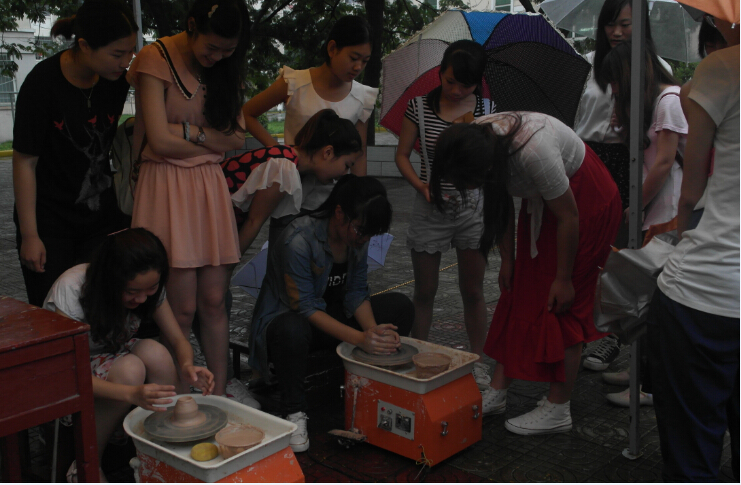 我国陶瓷艺术举世闻名,陶瓷文化积淀深厚,博大而灿烂。本次活动分为前期讲解和后期制作两个阶段,在现场主持人的耐心讲解制作工艺之后,同学们纷纷转动起手中的设备,相互协作,并不时交流心得,在经过繁杂的手续之后,一个个初具造型的陶胚完成了。形状各异的陶胚体现着当代大学生的创新和动手能力,整个活动中充满了欢声笑语,同学们的激情与活力在这里得到了充分展示。