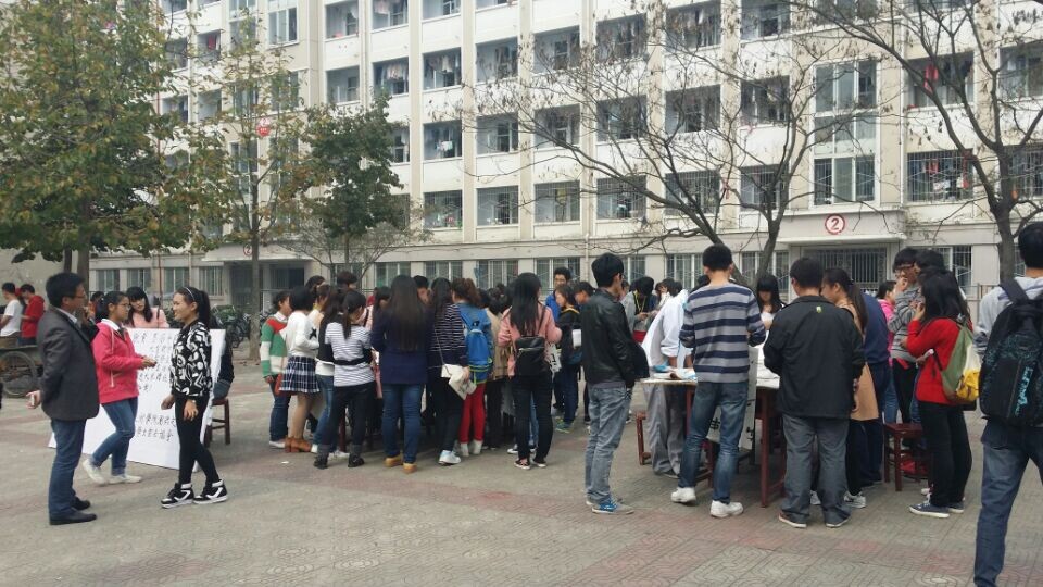 10月18日,由美术学院主办,大学生书法协会协办的“感悟正能量,墨洒中国梦”书画赠送活动在八餐小广场举行,社联副主席岳楠、王跃,美术学院学生会副主席李雪,34届书法协会会长张伟通,35届书法协会会长赵军帅担任开幕嘉宾并与同学们共同参加了此次活动。