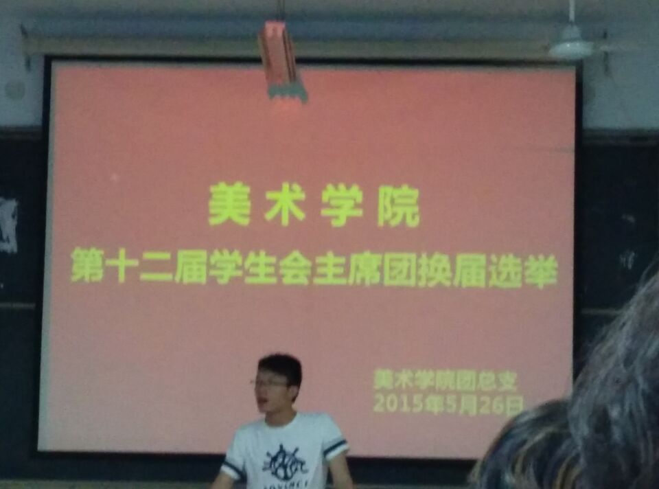 5月26日,全体学生会成员集聚在艺术楼307,进行美术学院第十二届学生会主席团换届选举,团总支张锐老师及学生会主席团成员进行主要评审。选举由学生会主席叶鹏飞主持。