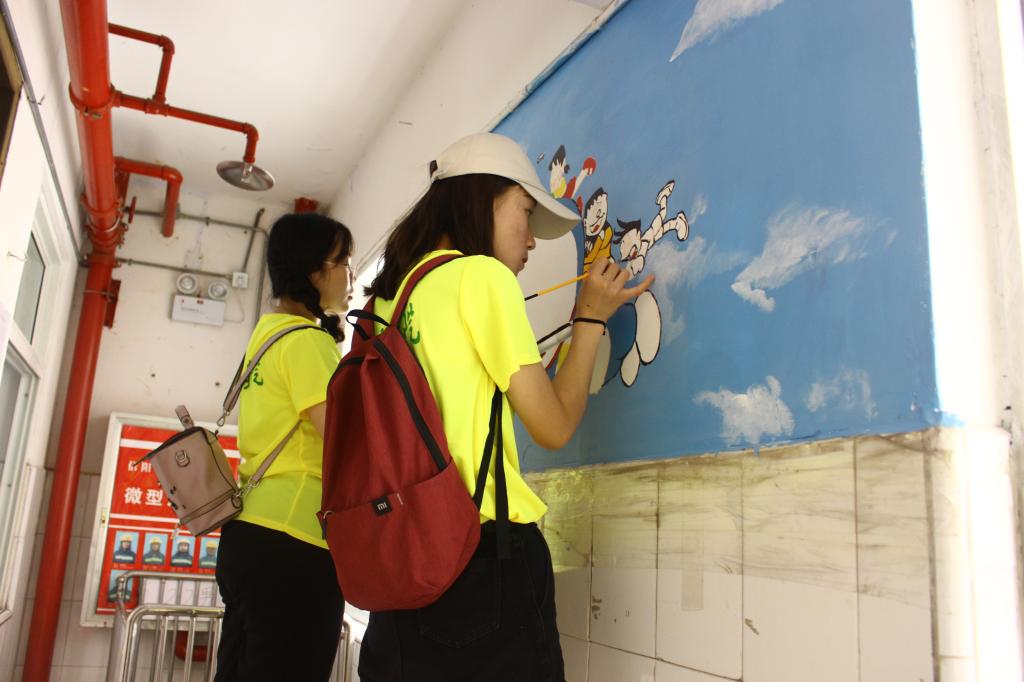 为确保此次活动的有序进行,我院认真积极筹备,提前与福利院沟通对彩绘墙体进行了测量、拟定墙绘方案。活动一开始,志愿者们便忙碌起来,搬颜料、整理工具、分配任务、划定区域,一切都有条不紊地进行着。志愿者们以丙烯为绘画的主要材料,对所画墙面进行巧妙设计,精心为孩子们绘制墙绘图案。