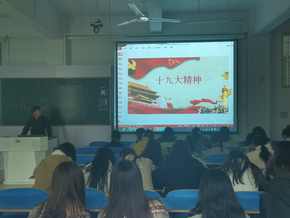 各班团支书以课件汇报的形式,对十九大精神的内涵与实质进行详细讲解,引导同学们坚定理想信念,自觉担负时代赋予的使命。激励着他们以十九大精神为指引,砥砺奋进、奋发有为,将个人理想和国家前途、民族命运紧密结合在一起。在班会进程中,与会人员仔细聆听、认真记录,学习氛围浓厚。期间,我院学子纷纷表示,要自觉把青春梦想融入伟大的中国梦中,时刻学习贯彻习近平新时代中国特色社会主义思想和党的十九大精神,表达爱国情怀。