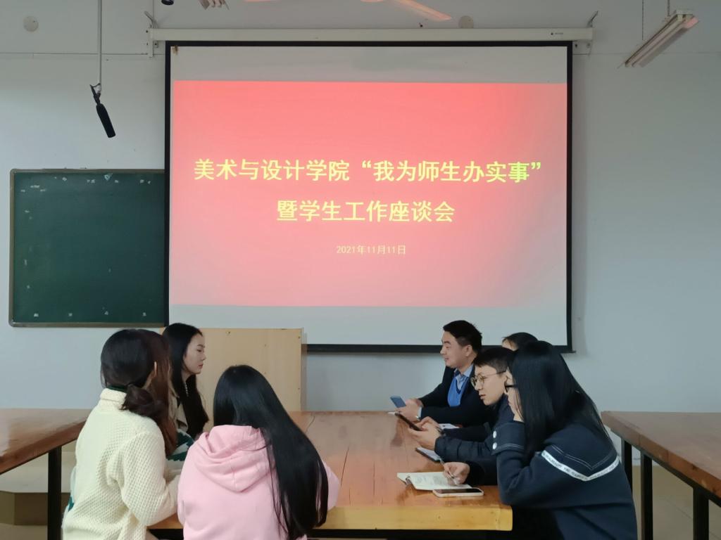 为了解学生近况,帮助学生解决实际问题。11月11日,我院于艺术楼308教室召开“我为师生办实事”暨学生工作座谈会。党委副书记周刚,辅导员饶海虹、郑波、胡霁芳及各班学生干部共同参加本次会议。会议由郑波主持。