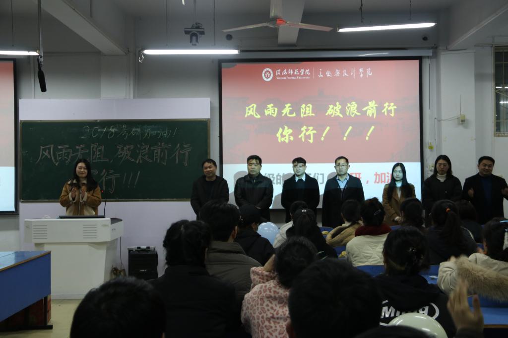 为关心我院考研学子,激发考试斗志,12月16日下午,我院于艺术楼307教室举行“风雨无阻,破浪前行,你行!”考研壮行会。党委书记兰洋,副院长张伟、董建义,党委副书记周刚,辅导员班主任郑波、饶海虹、胡霁芳、明政老师,学生会主要干部以及2018级共同参与此次活动。活动由胡霁芳主持。