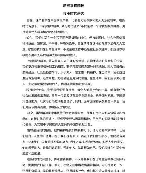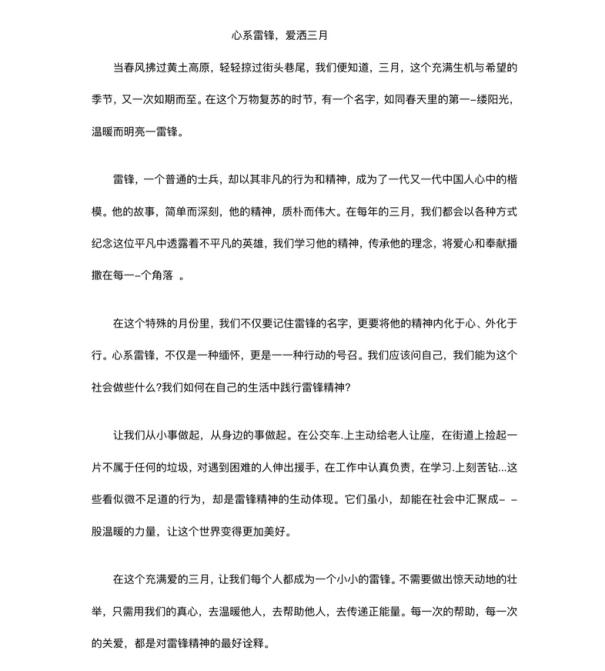 此次征文活动,以雷锋精神为核心,唤起了同学们对雷锋精神的关注,有助于引导大家在日常生活中践行雷锋精神,为构建和谐社会贡献青春力量。