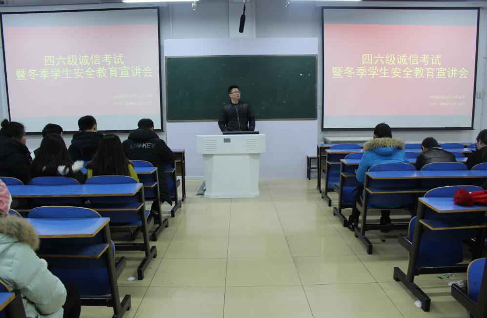 为树立优良的学风和校风、提高学生安全防范意识,12月13日晚,太阳成集团tyc33455在艺术楼307室召开四六级诚信考试暨冬季学生安全教育宣讲会,我院14级视传班学生参加了此次会议,会议由我院辅导员张锐主持。