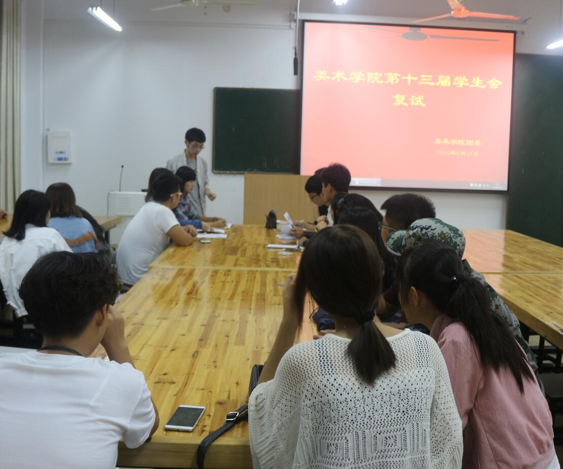 9月26日晚,招新复试在艺术楼217、306、307、308四个教室同时进行,各部部长、副部长担任评委,复试分为竞选演讲和即兴问答两部分,竞选者依次有序上台,就自己对所报部门的认识、自身的优势和特长以及进入部门后的展望等方面进行了精彩的演讲。在即兴问答环节中,面对评委们犀利的问题,竞选者们机智的回答赢得了现场同学们的阵阵掌声。他们从容的陈辞充分展现了美院学子良好的精神风貌。