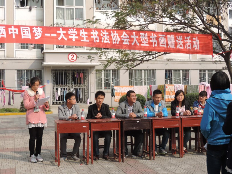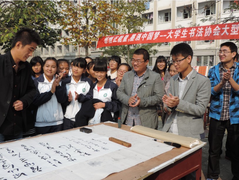 为喜迎第八届社团文化节,陶冶大学生艺术审美情操,10月27日,由大学生书法爱好者协会主办的“感悟正能量,墨洒中国梦”大型书画赠送活动,在八餐小广场如期举行,美术学院团总支书记周贤亮、美术学院学生会副主席孙超、社团联合会主席党浩凯、大学生书法爱好者协会历届会长等出席本次活动。