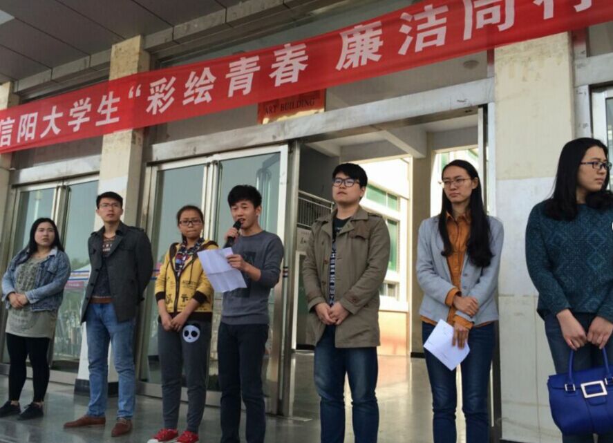 由信阳师范学院校团委、共青团信阳华锐学院委员会、信阳师范学院美术学院团总支、信阳师范学院大学生美术爱好者协会承办,信阳师范学院社团联合会、信阳师范学院社团联合会、信阳华锐学院社团联合会、信阳华锐学院设计绘画爱好者协会协会共同协办的“彩绘青春 廉洁同行”信阳大学生涂鸦大赛在艺术楼广场隆重举行。