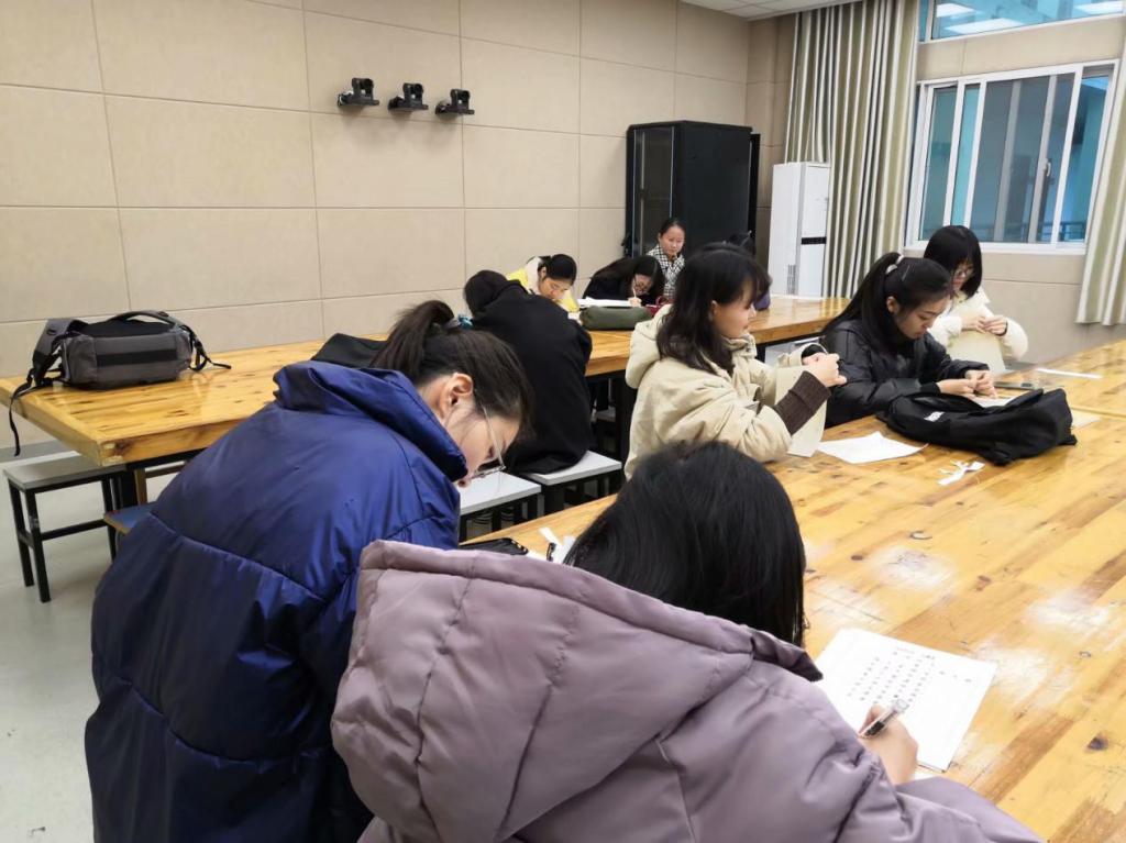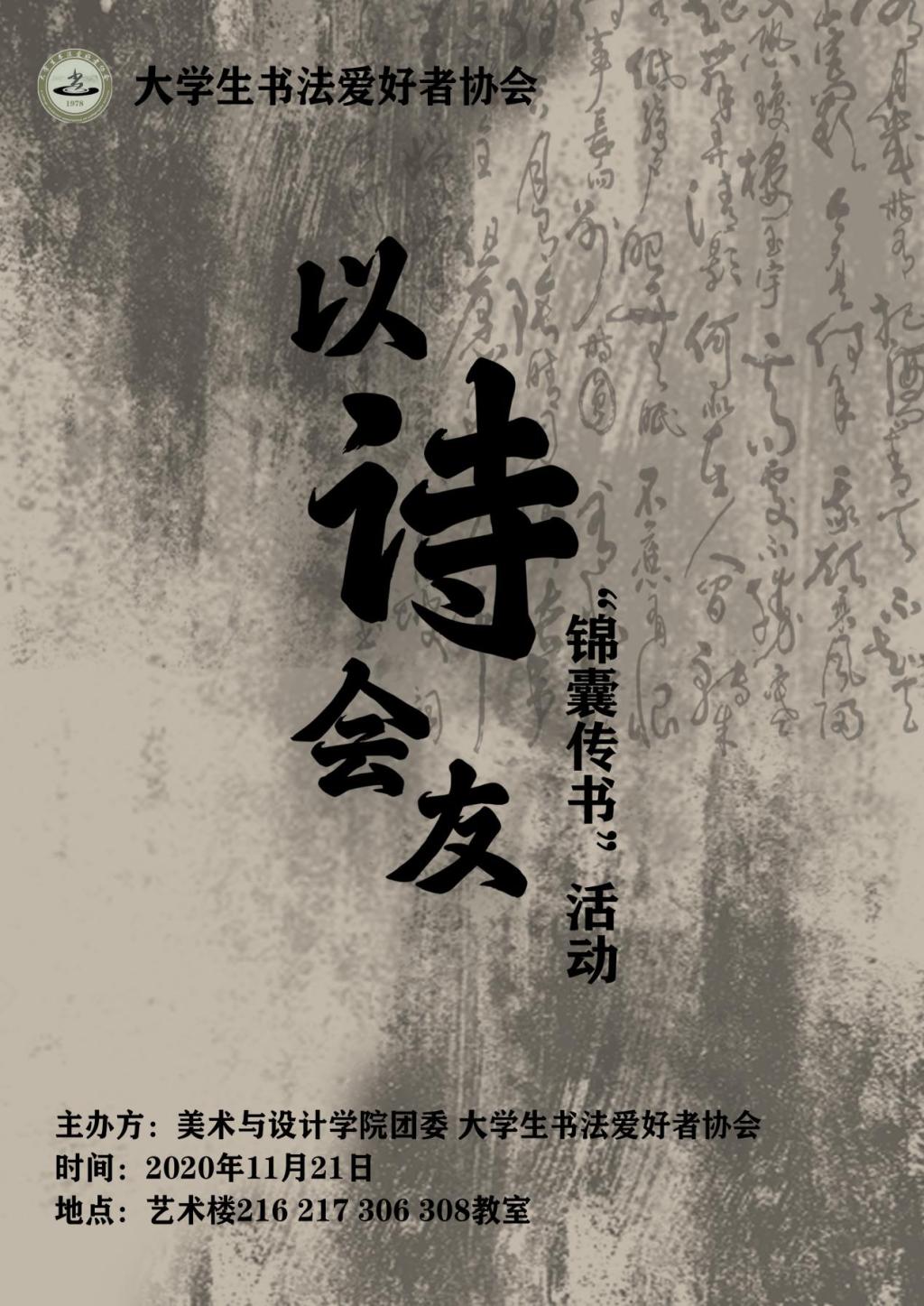 为了丰富大学生们的校园文化活动,我院大学生书法爱好者协会于11月21日在艺术楼216,217,306,308教室举办了“以诗会友,锦囊传书”活动。活动由书协会长赵梦柯主持。