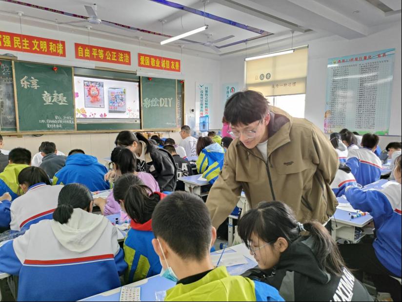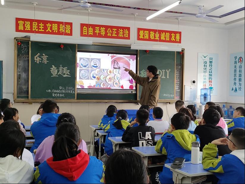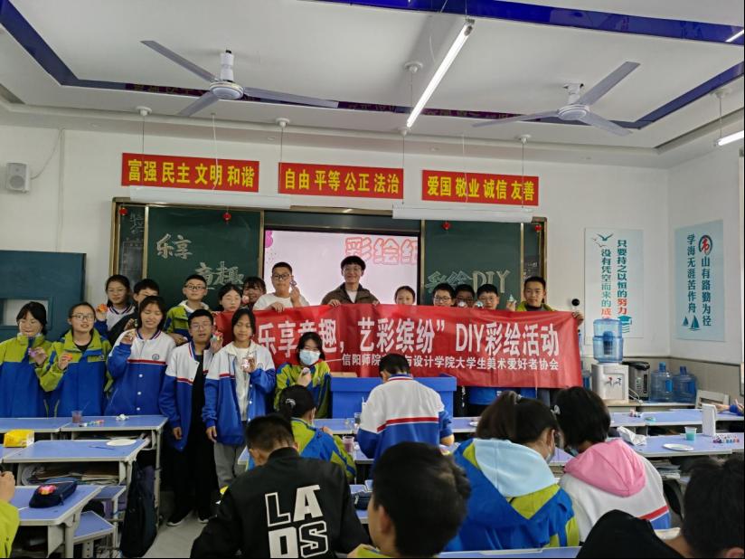 4月6日下午,大学生美术爱好者协会在信阳浉河中学开展“乐享童趣,艺彩缤纷”diy彩绘活动。此次活动由我院大学生美术爱好者协会主办,学院团委老师饶海虹、美协会长唐浩然,团支书周孟亚及浉河中学七年级23班同学共同参与。