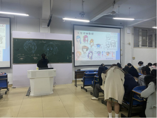 课程开始,杨立颖首先放映了一个关于“动漫人物”的小视频,以便同学们更好地了解其外貌,随后对“动漫”的概念及一些常见“动漫人物”五官画法进行讲解,与此同时绘画部干事任韬在旁辅助绘画,让同学们更直观清晰地体会绘画时笔的走向。课程最后,同学们自行熟悉本次授课内容,并进行练习,各部门部长对同学们进行了现场指导,指出同学们需要改进的地方,大家纷纷表示受益匪浅。