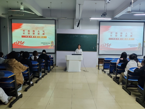 为深切缅怀为国家鞠躬尽瘁的英烈,弘扬他们的高尚精神,激发大学生的爱国情怀和民族自豪感,我院大学生艺术设计协会于11月9日晚在艺术楼307教室举办了“天地伟人气,长空祭英魂”主题团课。