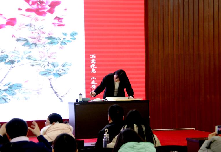 我院艺术硕士专业研究生路萍同学在闭幕式的汇报展示环节中对中国传统绘画进行了详细的讲解,并在五分钟画现场完成一幅惟妙惟肖的写意花鸟画,赢得了现场人员的热烈掌声。