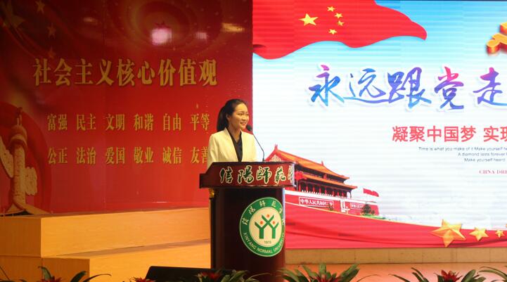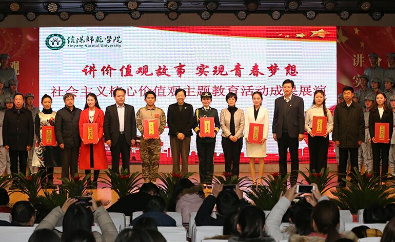 为了深入贯彻落实党的十九大精神,积极培育和践行社会主义核心价值观,1月9日,信阳师范学院“讲价值观故事,实现青春梦想”社会主义价值观主题教育活动成果展演于理科楼报告厅举行。中共河南省委宣传部副部长张曼如,中共河南省委文明办专职副主任王飞,中共信阳市委宣传部长曹新博,共青团河南省委副书记王笃波,中共河南省委宣传部未成年处处长张万勇,信阳市文明办主任祁登舰,我校党委书记宋争辉,校长李俊,校党委副书记郜火星,副校长齐城、王金云等领导嘉宾,与五百余名师生共同观看了展演。