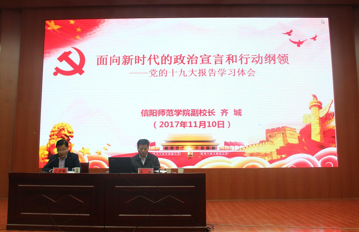 报告会上,齐城围绕“十九召开的时代背景和承载的历史使命”、“十九大的鲜明主题和战略意义”、“我国发展所处的新的历史方位”、“进入新时代主要矛盾的转化”、“当前面临的重大时代课题”、“以伟大实践成就伟大梦想”、“引领中华民族伟大复兴的指导思想”、“新时代中国特色社会主义的基本方略”、“实现民族复兴伟业的战略安排”、“实现民族复兴伟业的战略安排”等方面向大家分享了自己对党的十九大报告的学习体会。齐城指出党的十九大是在我国改革开放和社会主义现代化建设取得历史性成就、中国特色社会主义进入新时代的历史背景下胜利召开的。他表示进入这个新时期后,我们广大青年学子要不忘初心、继续前进,进行伟大建设,实现中国的伟大复兴。谈到“十九大鲜明的主题”时,齐城深入浅出地为同学们分析了该“主题”所蕴涵的深层次内容。他表示党的十九大报告全面总结改革开放以来的伟大成就,准确把握发展面临的困难和挑战,明确提出“经过长期努力,中国特色社会主义进入了新时代”,这是我国发展新的历史方位。关于主要矛盾转化的问题,他结合民生状况、教育现况、经济发展等领域的时事热点,提出了进入新时代“主要矛盾“的转化体现了我党实事求是的执政理念,其关乎着我国的发展全局,要破解“主要矛盾”就要贯彻落实新发展理念。他认为进入新时代我国所面临的时代课题具有鲜明的时代烙印,我们每个人都要扛起历史所赋予的职责。他指出十九大的召开奠定了实现中华民族伟大复兴的领导基础,开辟了中华民族伟大复兴的新境界。齐城结合马克思主义在我国的传播历史,及我党历届领导人的思想发展历程,提出了习近平新时代中国特色社会主义思想的丰富内涵是马克思主义中国化的最新成果,我党应在习近平新时代中国特色社会主义思想的领导下奋勇前进。