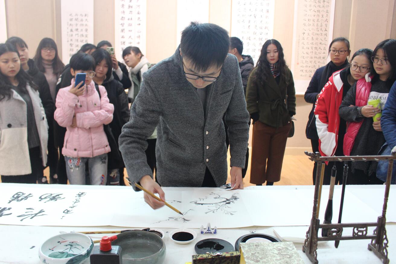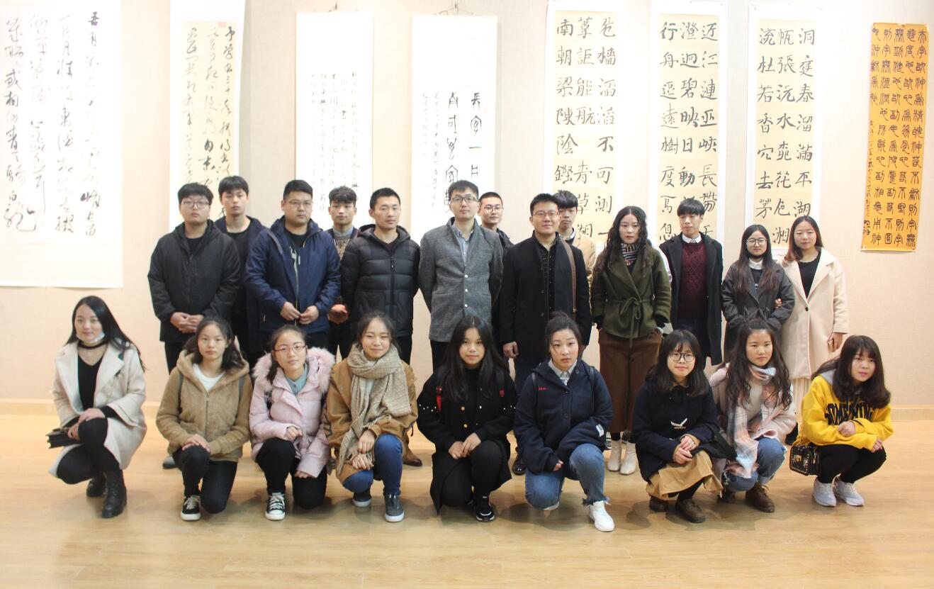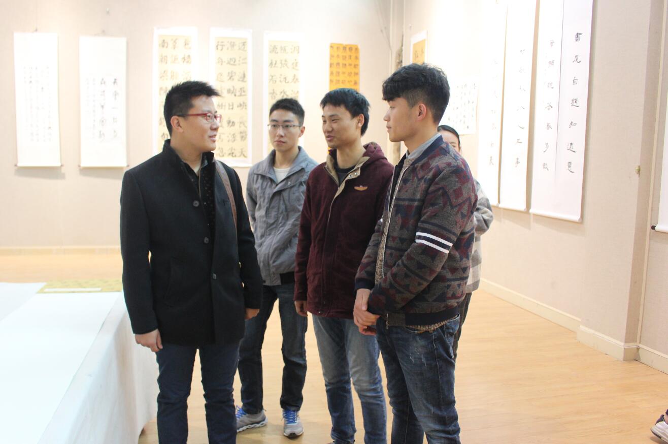 开幕式结束后,全体来宾和百余名师生相继到展厅观展。本届“申城杯”四校联赛书画作品展以“学习十九大,丹青颂盛世”为主题,以书法和绘画为主要形式,从千余幅参赛作品中评选出近百幅作品展出,在尽显中国传统文化之美的同时,也充分展现出了当代大学生热爱传统文化和积极进取、勇于创新的青春风采。各位嘉宾对此次活动给予了高度评价,并在展厅对学生们进行现场指导,共同书写了十余米长的册页,使同学们现场感受了书法艺术之美。