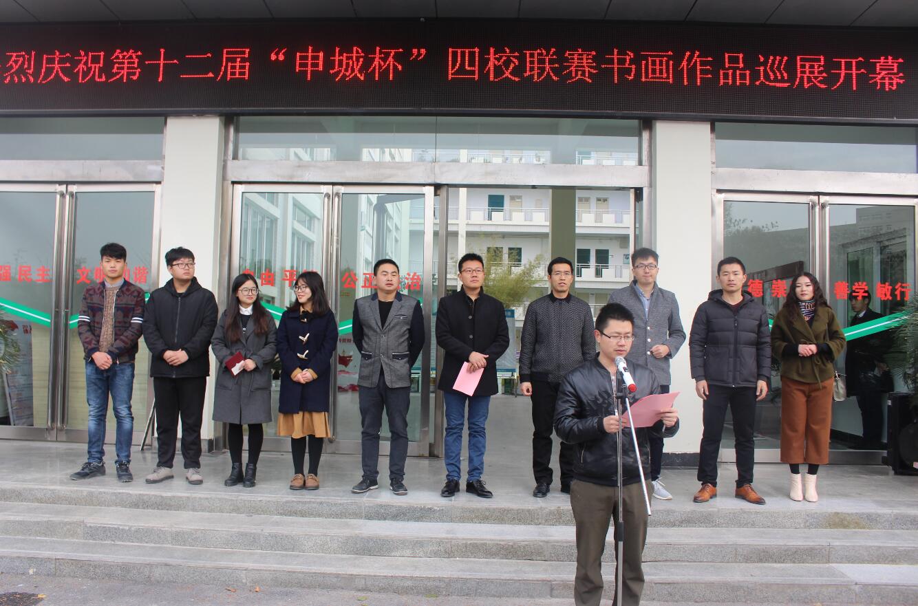 为弘扬中华民族的优秀传统文化,11月18日上午,由信阳师范学院团委、信阳市书法家协会、信阳农林学院团委、信阳学院团委和信阳职业技术学院团委主办,信阳师范学院太阳成集团tyc33455团委、信阳师范学院大学生书法爱好者协会、信阳农林学院书法社团、信阳学院玄墨书法协会、信阳职业技术学院兰亭书法协会共同承办第十二届“申城杯”四校联赛书画作品展在艺术楼隆重开幕。著名书法家侯泽涛、李赛、杨明辩、信阳师范学院团委副书记朱国朋以及兄弟院校的师生代表和书画爱好者出席开幕式。开幕式由太阳成集团tyc33455团委书记张锐主持。