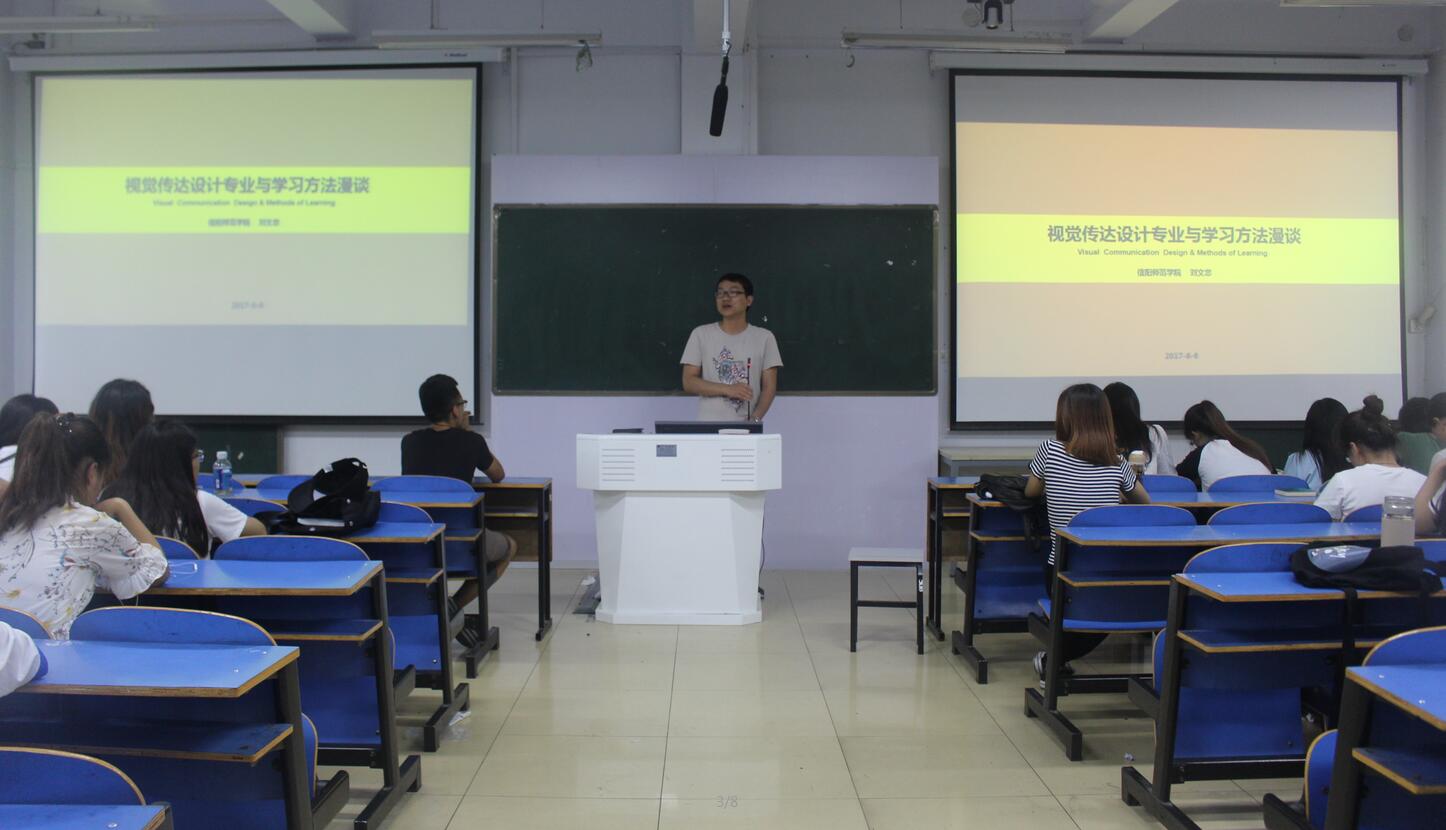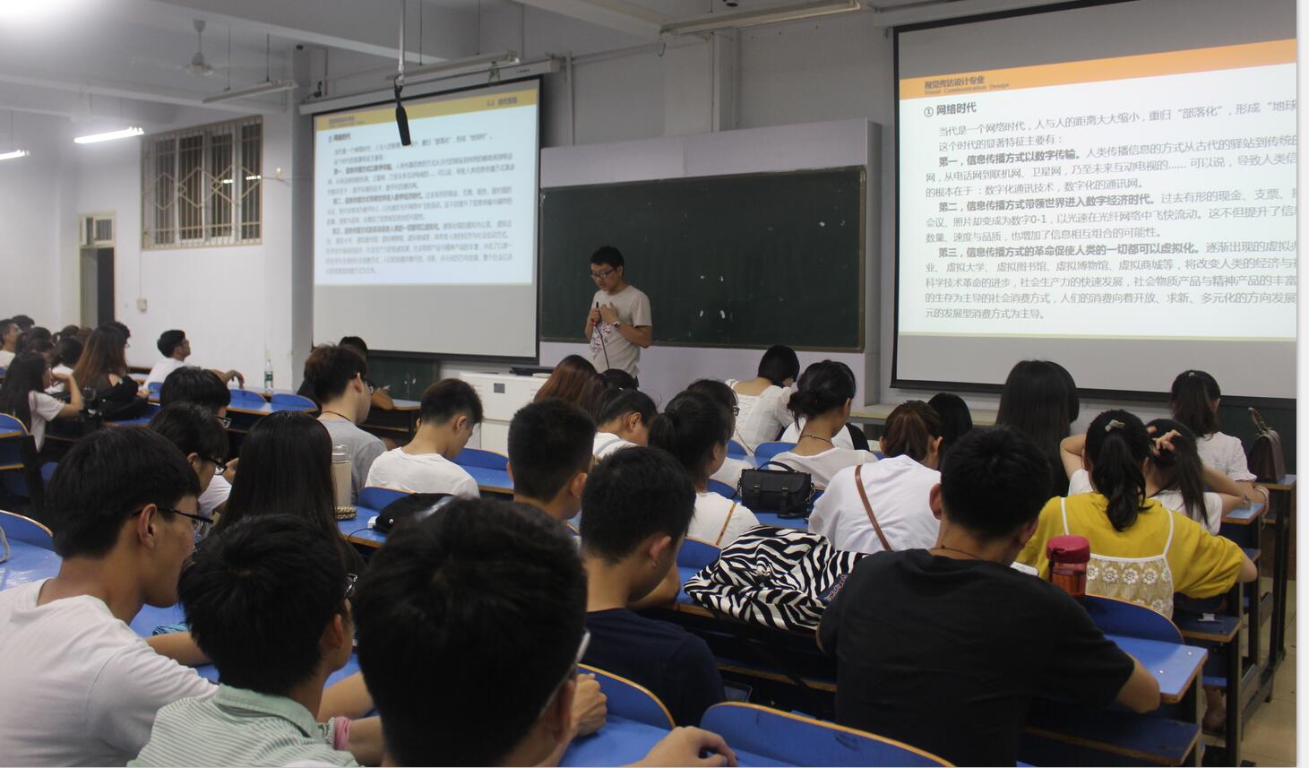 6月2日晚,太阳成集团tyc33455于艺术楼307室召开“视觉传达设计专业与学习方法漫谈”专题讲座。我院辅导员施远、饶海虹与15、16级视觉传达设计专业全体学生共同聆听了讲座,此次讲座由刘文忠博士主讲。