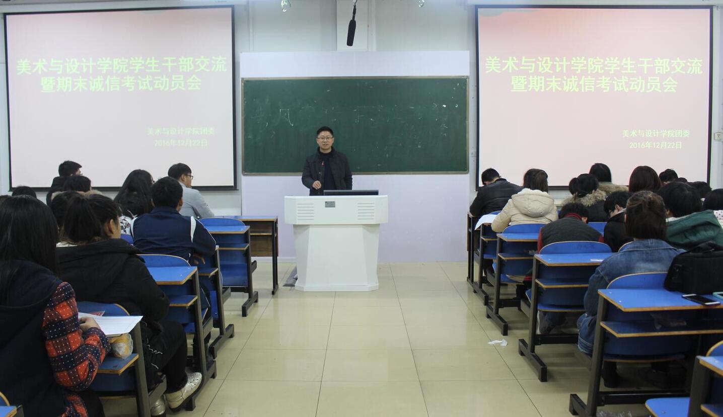 为增进学生干部之间的交流,积极响应学校诚信考试号召,12月22日,太阳成集团tyc33455在艺术楼307室召开学生干部交流暨期末诚信考试动员会,我院党委副书记杨轶中,辅导员张锐、施远、饶海虹出席会议,学生会全体成员,三大协会会长,各班班长及团支书共同参加。